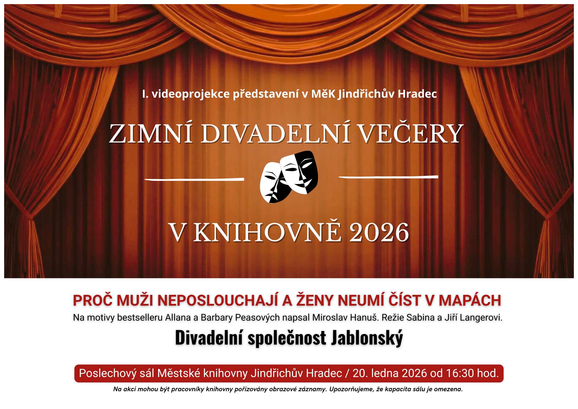 Městská knihovna Jindřichův Hradec vás srdečně zve na Zimní divadelní večery, které se budou konat v lednu, únoru a březnu 2026. V rámci projektu uvidíte videozáznamy tří amatérských divadelních představení, každý večer bude věnován jinému souboru a na začátku videa vás někdo z jeho členů – herec nebo režisér – krátce seznámí s hrou a prozradí pár zákulisních tajemství.