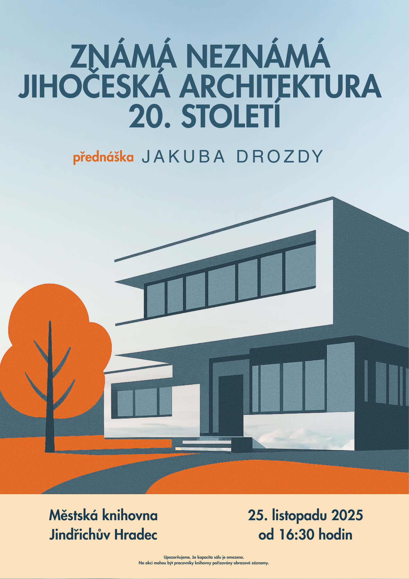 Přednáška představí významné, ale často opomíjené architektonické skvosty jižních Čech z 20. století. Jakub Drozda se zaměří na jejich historický kontext, stylovou rozmanitost i současné výzvy spojené s jejich ochranou. Přednášku doprovází tematická výstava v suterénu knihovny (listopad-prosinec 2025).