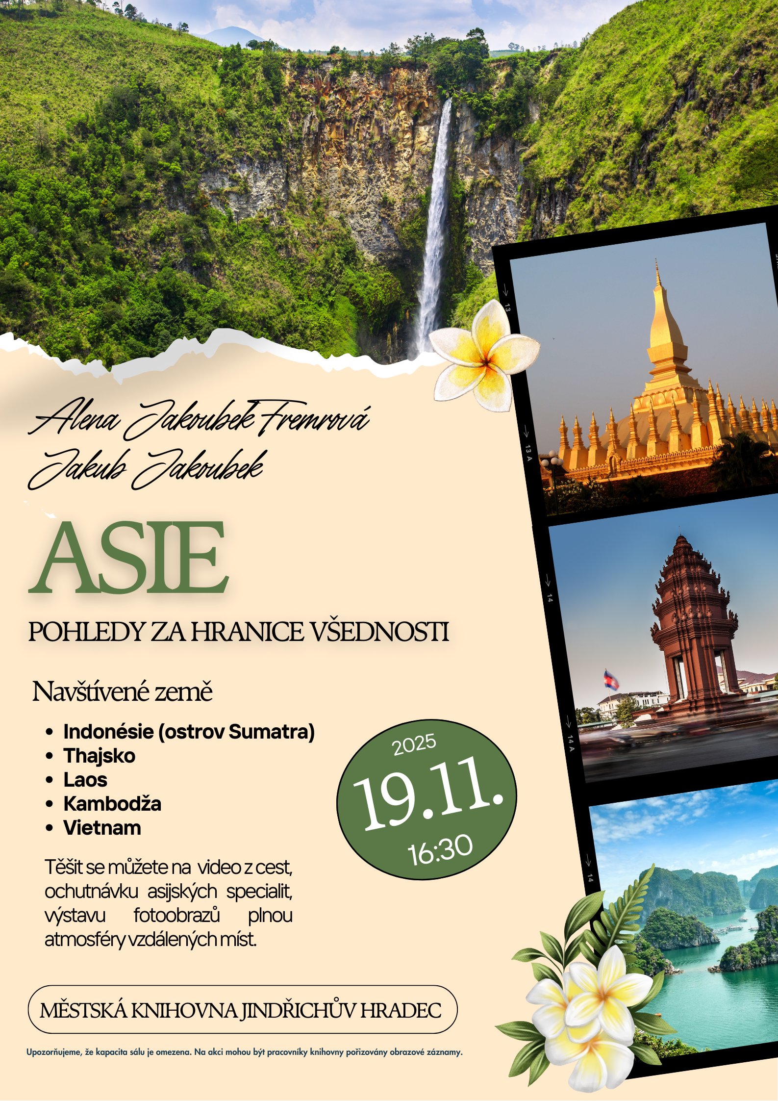 Zveme vás na cestovatelskou besedu s Jakubem Jakoubkem, který se svou ženou procestoval exotická zákoutí Asie. Dozvíte se, jaké to je strávit měsíc na opuštěném ostrově, objevovat divokou Sumatru nebo prozkoumat Thajsko, Laos, Kambodžu a Vietnam. Besedu doprovodí promítání krátkého videa z jejich cest a možnost ochutnat některé asijské pochutiny. Na závěr si můžete prohlédnout i výstavu fotoobrazů zachycujících atmosféru těchto míst.