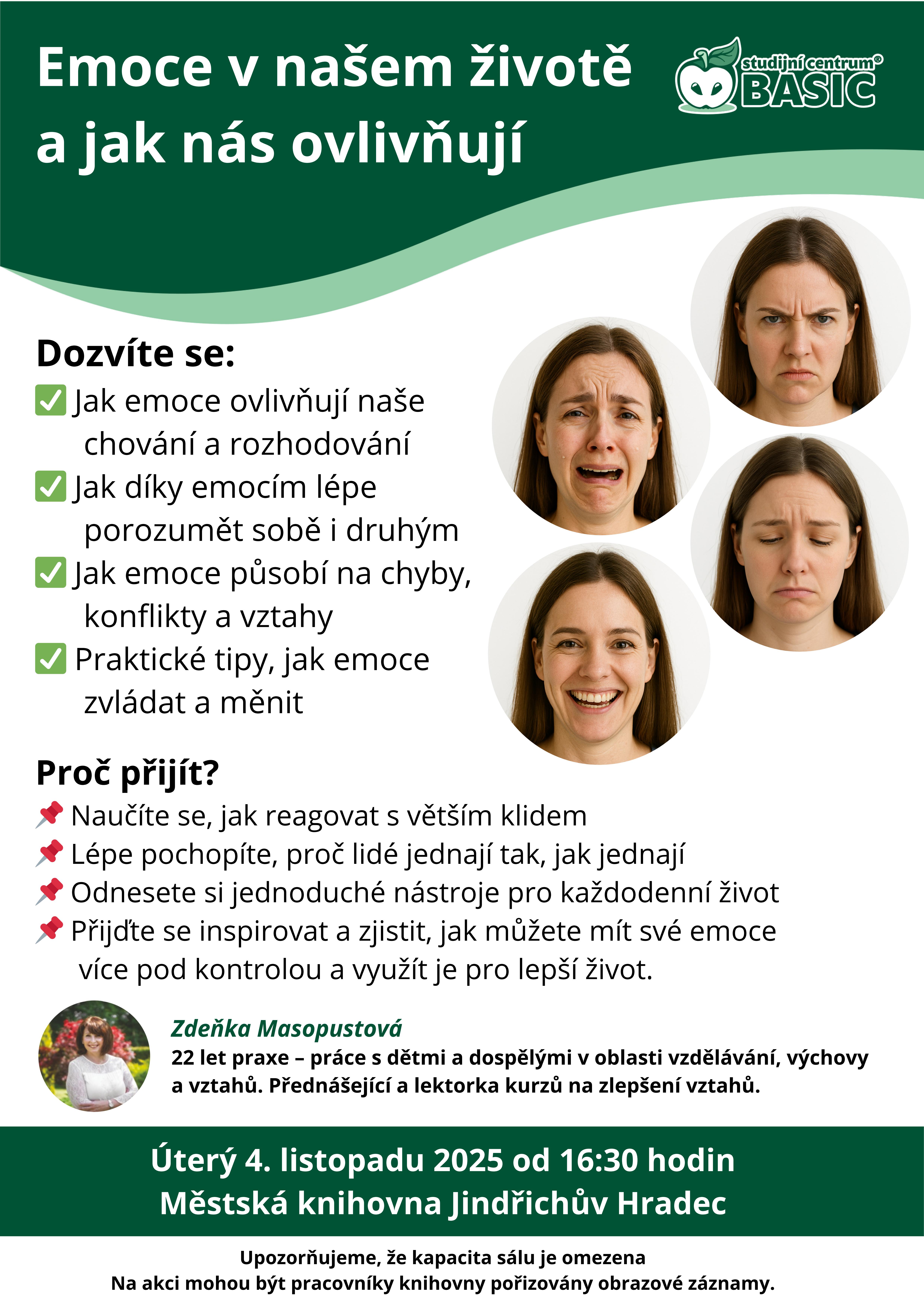 Emoce provázejí každého z nás – ovlivňují naše rozhodování, vztahy i celkovou spokojenost. Přijďte se dozvědět, jak emoce vznikají, k čemu nám slouží a jak s nimi můžeme lépe pracovat v každodenním životě. Akce je určena všem, kdo se chtějí lépe vyznat ve vlastních prožitcích a porozumět jim v širších souvislostech.