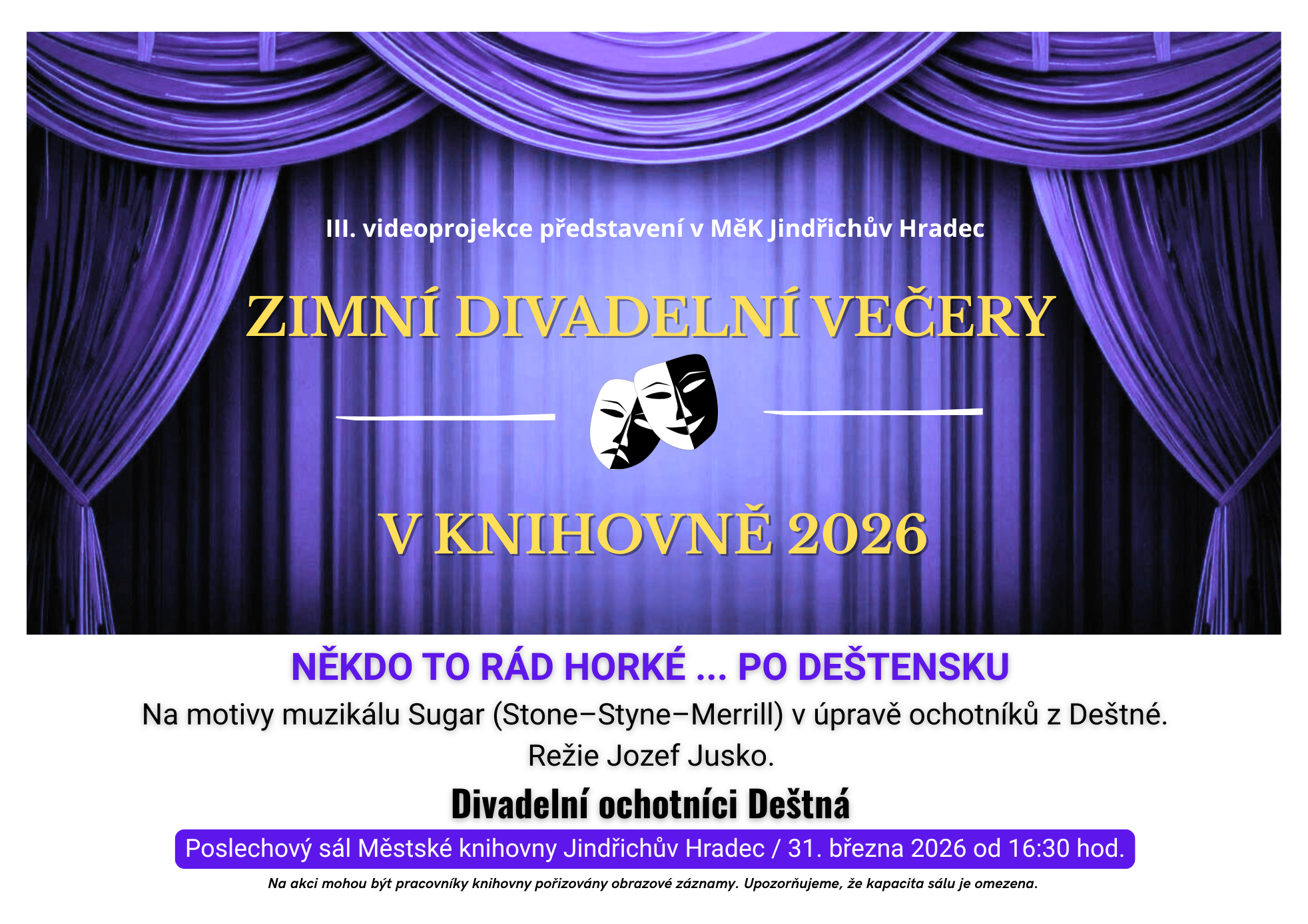 Zimní divadelní večery v Městské knihovně Jindřichův Hradec se v březnu 2026 blíží do finále. V rámci projektu uvidíte poslední videozáznam amatérského divadelního představení, tentokrát v podání ochotníků z Deštné. Úvodem k projekci vás člen souboru krátce uvede do děje a nabídne pohled do zákulisí jejich tvorby.