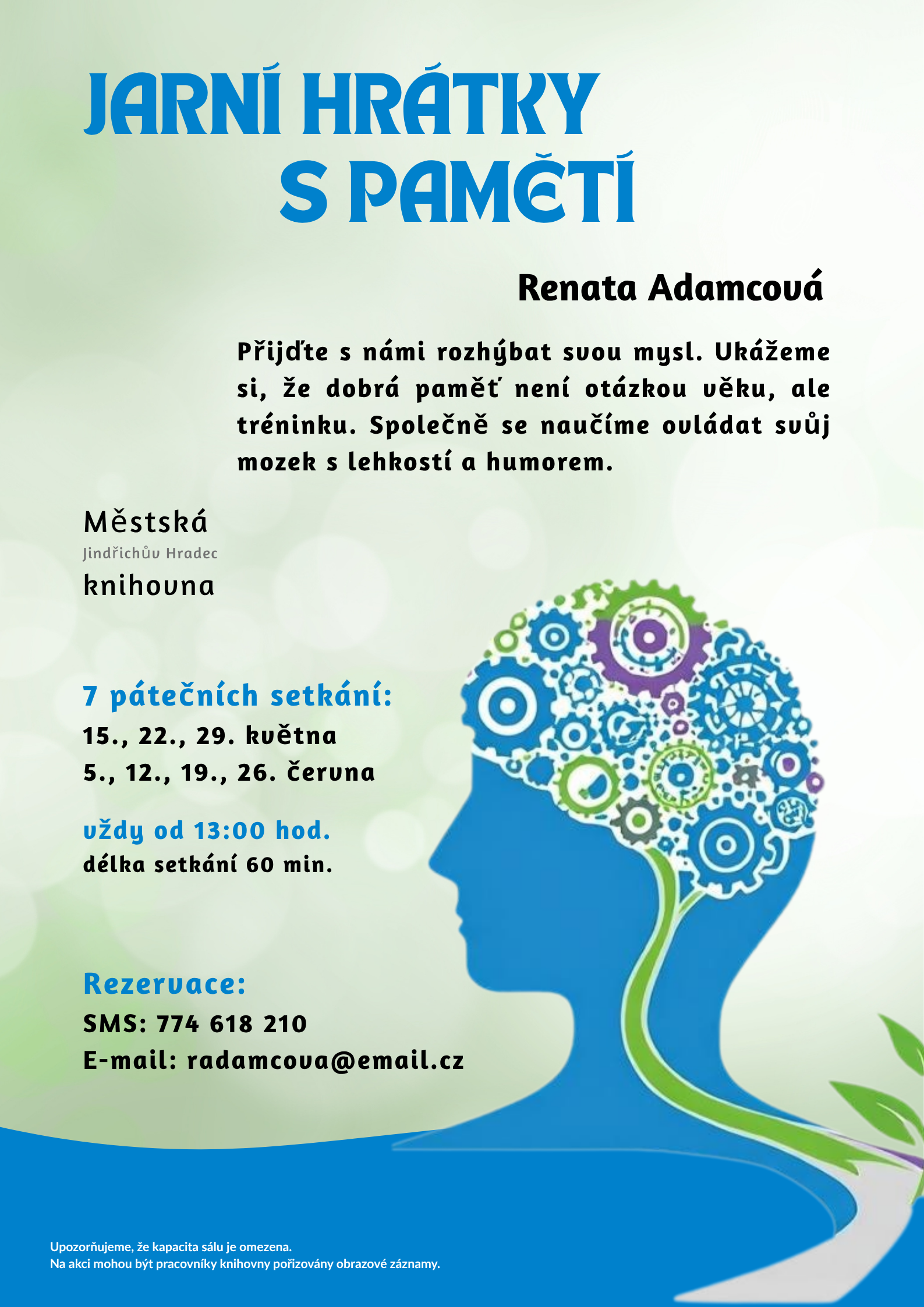 Jarní cyklus trénování paměti nabídne sedm hravých setkání, během nichž objevíte, jak s lehkostí a humorem zlepšit svou paměť i koncentraci. Naučíte se praktické mnemotechniky využitelné v každodenním životě a zjistíte, že bystrá mysl není otázkou věku, ale pravidelného tréninku. Kurz je určen všem, kdo chtějí svůj mozek udržet v kondici, odreagovat se a zároveň získat nové dovednosti i příjemné zážitky. Kapacita kurzu je omezená – své místo si rezervujte prostřednictvím SMS na tel. 774 618 210 nebo e-mailem: