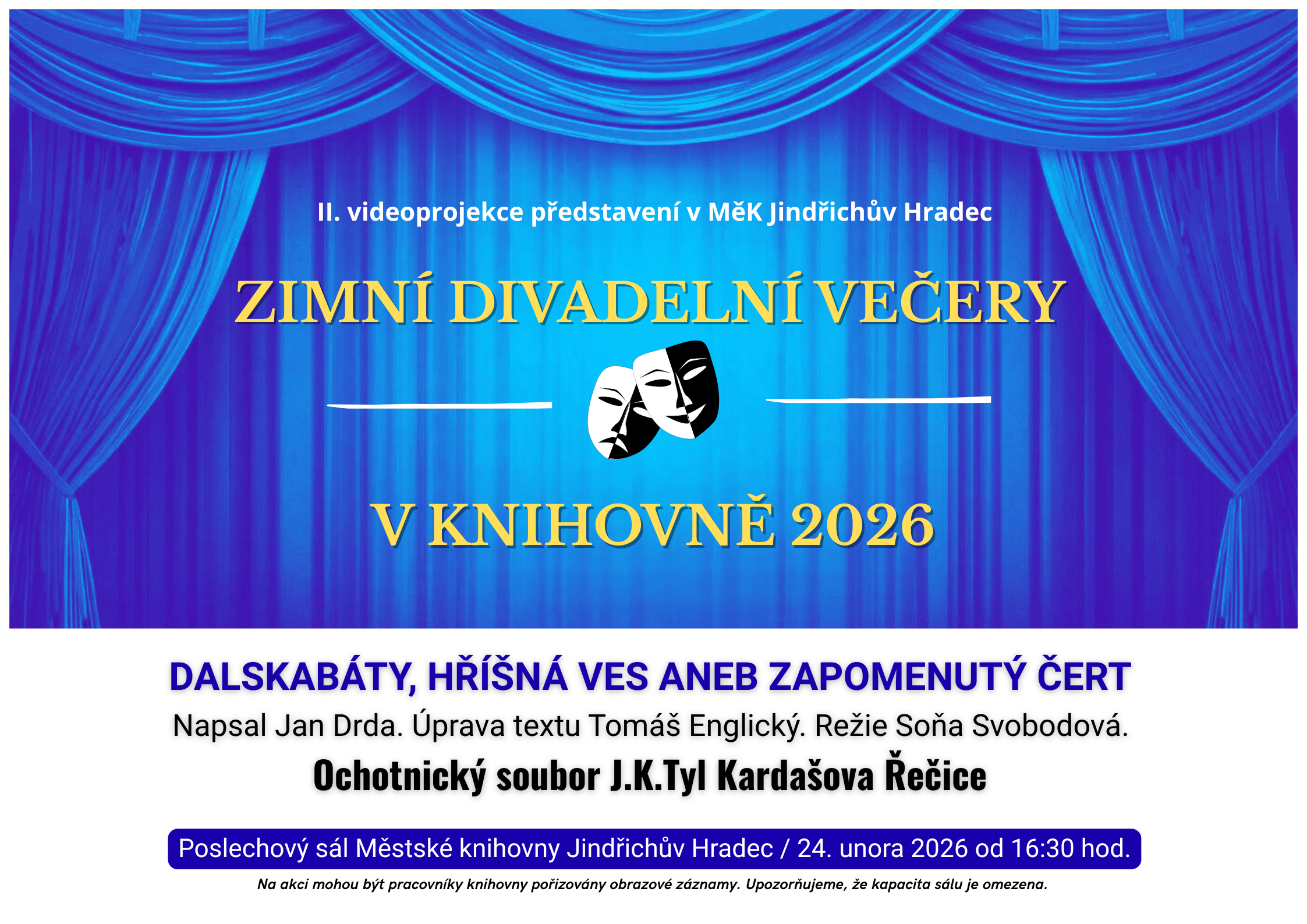 Zimní divadelní večery v Městské knihovně Jindřichův Hradec pokračují i v únoru 2026. V rámci projektu uvidíte další videozáznam amatérského divadelního představení, tentokrát v podání divadelního spolku z Kardašovy Řečice