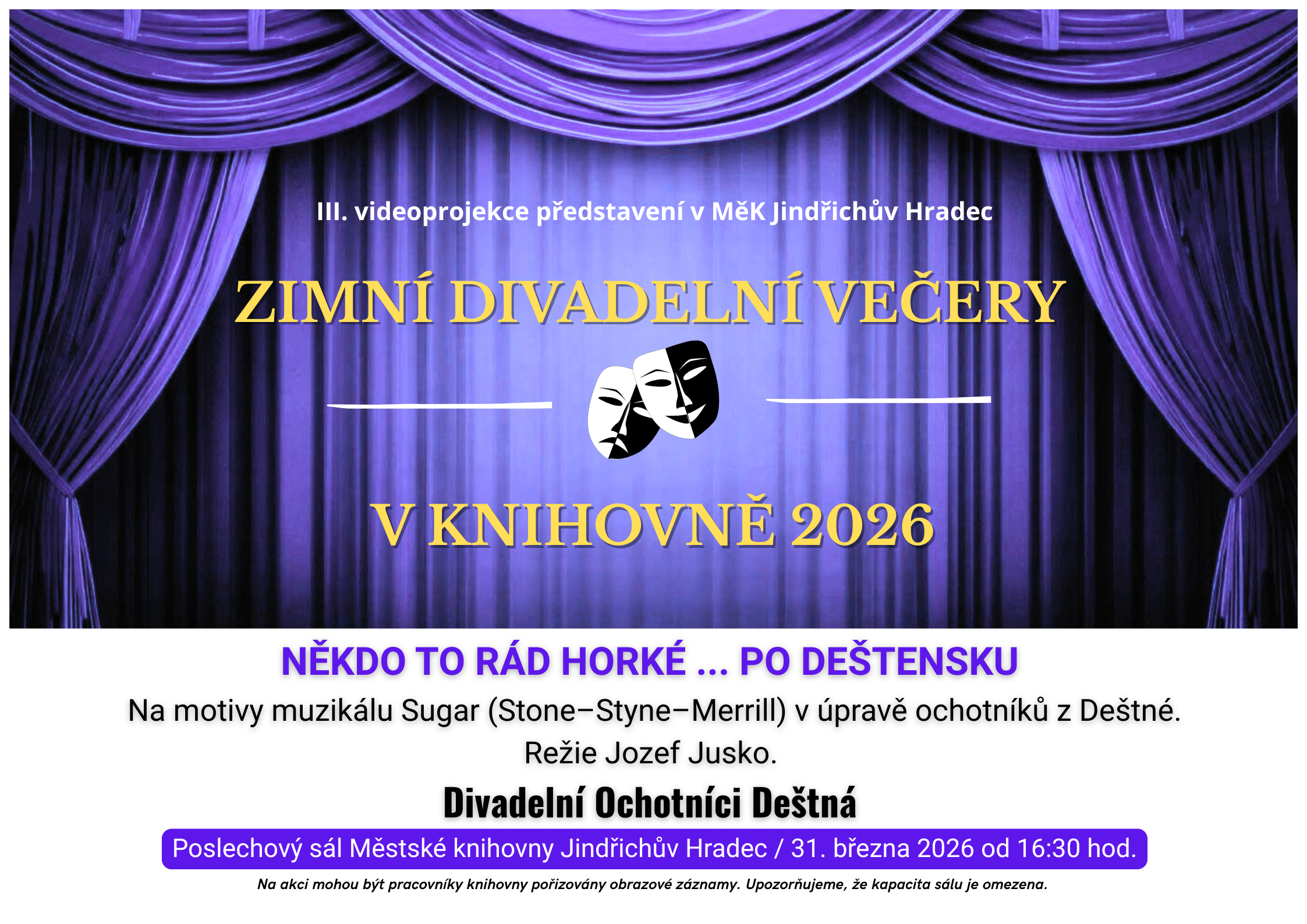 Zimní divadelní večery v Městské knihovně Jindřichův Hradec se v březnu 2026 blíží do finále. V rámci projektu uvidíte poslední videozáznam amatérského divadelního představení, tentokrát v podání ochotníků z Deštné. Úvodem k projekci vás člen souboru krátce uvede do děje a nabídne pohled do zákulisí jejich tvorby.